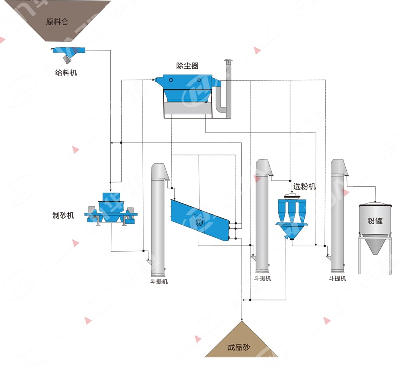 該系統(tǒng)主要用于生產(chǎn)預拌砂漿用細砂,設計產(chǎn)量為50t/h,原料為-30mm以下的碎石,成品砂細度模數(shù)2.4-3.0之間可調(diào)整,石粉含量控制在5%-15%,系統(tǒng)配置的核心主機設備為洛陽大華生產(chǎn)的PLS1000專用精品制砂機1臺,該設備成品粒形好,粒度穩(wěn)定,設備使用成本低,維修保養(yǎng)簡單。其它配套主機還有多層細粒篩分機1臺,高效選粉機1套,環(huán)保除塵設備1套,斗式提升機3套,粉料罐1套及其它相關(guān)計量和輸送設備等。