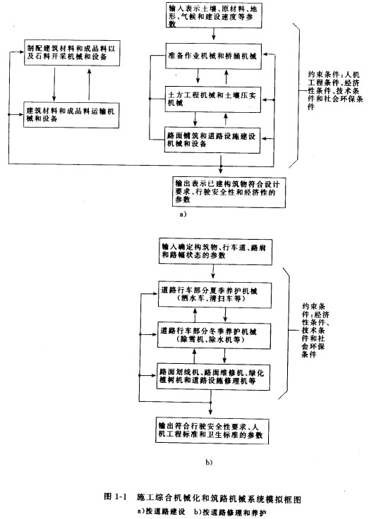 道路建設(shè)綜合機(jī)械化和自動(dòng)化用多種機(jī)械系統(tǒng),包括由施工過程決定的五種主要機(jī)組:土路基施工用機(jī)械;路面鋪筑機(jī)械;橋涵和邊坡施工機(jī)械,道路建筑材料開采和加工機(jī)械及工藝所需的運(yùn)輸設(shè)備等。
