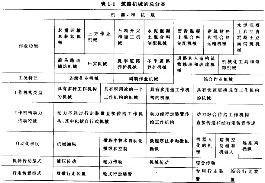 筑路機(jī)械根據(jù)機(jī)器和工作機(jī)構(gòu)作業(yè)和結(jié)構(gòu)特征的總分類列于表1-1。