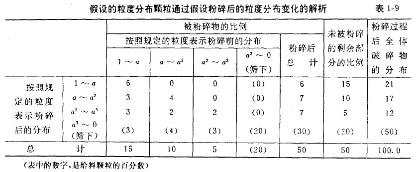 由表1—9可見,粉碎后總計欄表示受粉碎作用的粒子粉碎后的分布。如加上未受粉碎作用的部分,則可得最后一列所示的粉碎后全部粒子的分布,即粉碎作用產(chǎn)生了{30 20 10}—{21 17 12}粒度分布的變化。