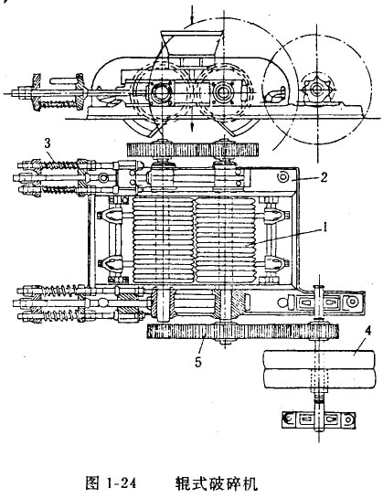 圖1—24所示為輥式破碎機。破碎輥1固裝在破碎機架2上,另一個破碎輥在彈按壓力下作水平滑動。裝在這個輥上的彈簧3是對非破碎物(鏟齒、鐵塊等)的保護裝置。為了防止加入物料與兩輥發(fā)生摩擦,兩個破碎輥的轉(zhuǎn)速相等。出電動機通過三角皮帶輪4和齒輪5帶動固定輥,再通過適當(dāng)?shù)膫鲃友b置帶動滑動輥。也有的設(shè)計成每輥各有一臺電動機分別傳動。