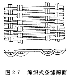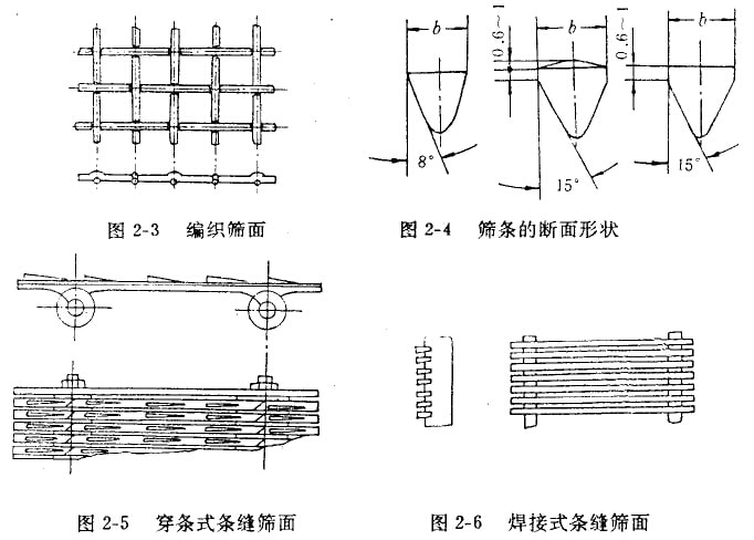 條縫篩面的結(jié)構(gòu)型式有穿條式(圖2—5),焊接式(圖2-6)和編織式(圖2—7)三種。