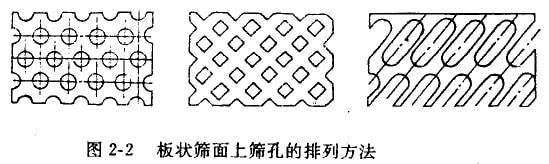 2.板狀篩面:板狀篩面通常由5—8mm厚的鋼板制成。板狀篩面上的篩孔形狀和排列方法如圖2—2所示。板狀篩面的優(yōu)點是比較牢固,剛度較大。使用壽命校長。其缺點是質(zhì)量大,開孔率較小(篩孔凈面積與篩而總面積之比),約為40一60%,板狀篩面一般用于中等粒級物料的篩分。篩孔尺寸通常為10一50mm。