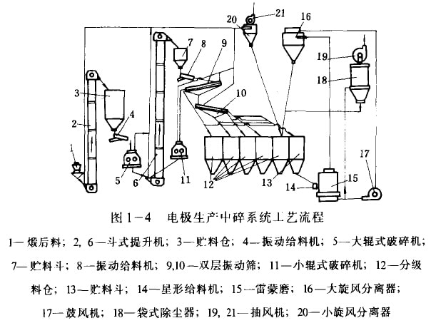 圖1—4為電極生產(chǎn)中碎系統(tǒng)綜合工藝流秤。由圖可見(jiàn),鍛后料1由提升機(jī)2提升到儲(chǔ)料倉(cāng)3,再由電磁振動(dòng)給料機(jī)4加到輥式破碎機(jī)5,破碎后的料由提升機(jī)6提升到儲(chǔ)料斗7,再由電磁振動(dòng)給料機(jī)8加到振動(dòng)篩9,大于4mm的料進(jìn)入小對(duì)輥破碎機(jī)11繼續(xù)破碎,然后進(jìn)人提升機(jī)6。從振動(dòng)篩9篩出的4—2mm的料進(jìn)入料倉(cāng)12(進(jìn)到4—2mm分級(jí)科倉(cāng))。小于2mm的料進(jìn)入振動(dòng)篩10,篩出的2—1mm、1—0.5mm、小于0.5mm的料分別進(jìn)入料倉(cāng)12的各分級(jí)料倉(cāng)中。料倉(cāng)12中的不平衡料進(jìn)入貯料斗13,再經(jīng)溜槽和星形給料機(jī)14加到雷蒙磨15進(jìn)行磨粉。磨細(xì)的粉由鼓風(fēng)機(jī)17鼓進(jìn)的風(fēng)帶著經(jīng)過(guò)雷蒙磨上的分離器進(jìn)入旋風(fēng)分離器16,使粉與空氣分離,分離出來(lái)的細(xì)粉下列0075mm分級(jí)料倉(cāng)中。經(jīng)分離后的空氣再經(jīng)鼓風(fēng)機(jī)吹入雷蒙磨。為了保持磨機(jī)內(nèi)一定的風(fēng)壓,多余的空氣被送到布袋除塵器18,除塵后的空氣由抽風(fēng)機(jī)19排放,粉塵下到0.075mm的分級(jí)料倉(cāng)。