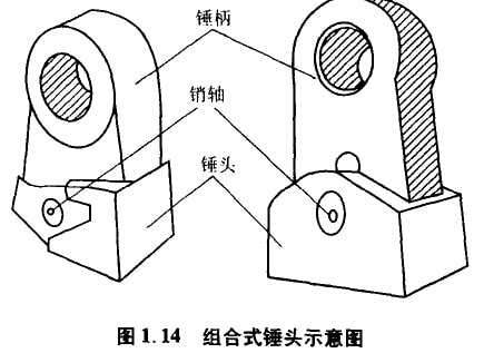 e)組合式錘頭。設(shè)計(jì)者將錘頭端部受沖擊易磨損部分制成活動件,使維修者不必卸下整個(gè)錘頭,只要拆裝沖擊頭部的銷軸,即可快速更換錘頭端部易損件。該錘頭的材質(zhì)以選用高鉻鑄鐵為多,也可選用其他耐磨材料。組合式錘頭式樣如圖1.14所示。