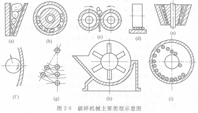(2)根據(jù)破碎方式、機械的構造特征(動作原理)來劃分,將破碎機械大體分為六類,如圖2—9所示。