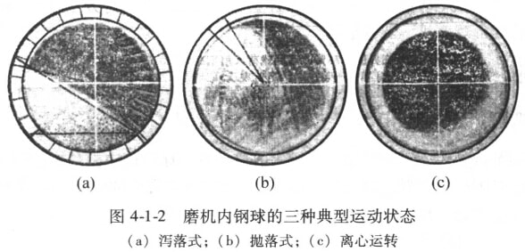 磨內(nèi)鋼球的狀態(tài)是一個(gè)變量狀態(tài)函數(shù),使鋼球狀態(tài)很難用數(shù)學(xué)手段量化確定。它的運(yùn)動(dòng)狀態(tài)依變量參數(shù)而變,變量參數(shù)種類數(shù)多,則鋼球狀態(tài)也紛繁。而且不少因素對(duì)狀態(tài)的影響目前還難于用函數(shù)關(guān)系表達(dá)出來(lái)。有研究者拍攝了磨內(nèi)的球荷的運(yùn)動(dòng)狀態(tài),從中選出三種典型運(yùn)動(dòng)狀態(tài),見(jiàn)圖4-1-2。