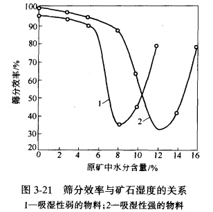 水分對(duì)某種物料的篩分過程的真體影響,只能根據(jù)試驗(yàn)結(jié)果判斷。篩分效率與物料濕度的 關(guān)系見圖3-21。由圖可知,水分對(duì)兩種物料的影響是不同的,其原因是這兩種物料具有不同的吸 濕性能。圖中曲線說明,當(dāng)物料含水分達(dá)到某一范圍時(shí),篩分效率急劇降低。這個(gè)范圍取決于物料性質(zhì)和篩孔尺寸。當(dāng)物料所含水分超過這個(gè)范圍后,顆粒的活動(dòng)性重新提髙,物料的黏滯性反而消失。此時(shí),水分有促進(jìn)物料通過篩孔的作用,并逐漸達(dá)到濕法篩分的條件。這時(shí),物料和水一起進(jìn)行篩分。