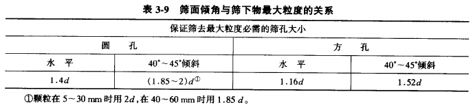 一般情況下,篩子是傾斜安裝的,以便于排出篩上物料。傾角大小要合適,傾角過小,物料在篩面上運(yùn)動(dòng)速度太慢,雖然篩分效率高,但篩子的生產(chǎn)率減。环粗,傾角太大,物料排出太快,篩分效率降低。當(dāng)篩面傾斜安裝時(shí),可以讓顆粒順利通過的篩孔尺寸只相當(dāng)于篩孔的水平投影,如圖3-22所示。能夠無阻礙地透過篩孔的顆粒直徑等于d = Icosa - hsina,式中I為篩孔尺寸,h為篩面厚度,a為篩子的傾角。由此可見,篩面的傾角愈大, 使顆粒通過時(shí)受到的阻礙愈大。因此,篩面的傾角要適當(dāng)。表3-9所示為篩面的傾角與篩下物最大粒度及篩孔尺寸的關(guān)系。