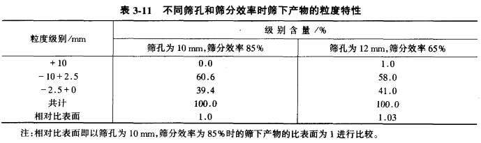 例如用短頭圓錐破碎機(jī)和振動(dòng)篩構(gòu)成閉路破碎中硬礦石時(shí),要求破碎最終產(chǎn)物粒度為10 mm,檢查篩分的篩孔尺寸應(yīng)為10 mm,此時(shí)的篩分效率為85%;但是,也可以采用篩孔尺寸為12 mm,而將篩分效率降低至65% (通過(guò)改變篩面傾角或增加給礦量),采用上述兩種篩分工作制度,所得到的篩下產(chǎn)品有著相同的比表面積(單位質(zhì)量的表面積m2/t),即篩下產(chǎn)品有相同的平均粒度。見(jiàn)表3-11。也就是說(shuō),篩下產(chǎn)物的質(zhì)最是相等的。