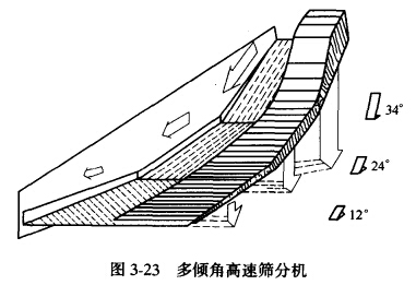 圖3-23為采用等厚篩分法的多傾角高速篩分機(jī)示意圖。它由不同傾角的三段篩面所組成: 第一段34°,第二段24°,第三段12%不同的傾角,適應(yīng)篩子不同部位細(xì)粒物料通過(guò)速度的要求, 這樣可以提高生產(chǎn)能力。由圖可見(jiàn),給料段的物料運(yùn)動(dòng)速度為3~4 m/s,料層薄,物料中細(xì)粒的 60%~70%被篩下。中段速度為1~1.5m/s,末端速度為0.5~0.8m/s,以便使剩余的細(xì)粒有足夠的時(shí)間通過(guò)篩孔。因此,在整個(gè)篩面上物料的運(yùn)動(dòng)速度是遞減的,而料層厚度是相等的(或遞增)。在相同生產(chǎn)能力時(shí),篩分面積可以節(jié)省20%~30%,因而使基建和生產(chǎn)費(fèi)用降低。