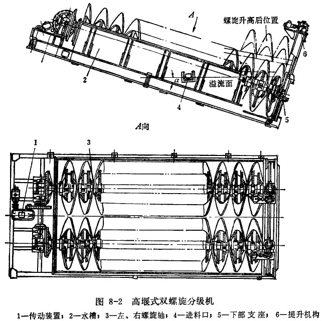 圖8-2為高堰式雙螺旋分級機(jī)的結(jié)構(gòu)圖。半圓形水槽2通常用鋼板和型鋼焊成,其側(cè)壁沒有進(jìn)料口。返砂口介槽體上端的下部。為了在必要時能排出砂漿,水槽下部沒有放水閥,正常工作時關(guān)閉。