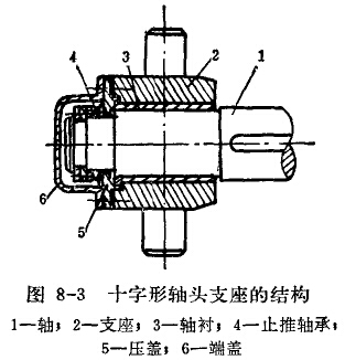 十字形軸頭支座的結(jié)構(gòu)如圖8-3所示。支座兩側(cè)的軸頭支承在傳動架上。這種裝置可以滿足螺旋軸在作旋轉(zhuǎn)運(yùn)動的同時,又可作升降運(yùn)動。