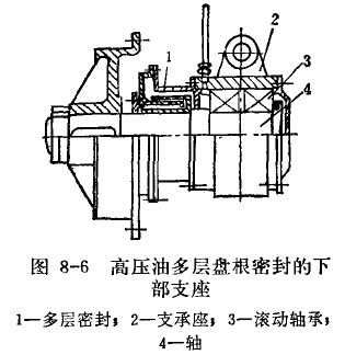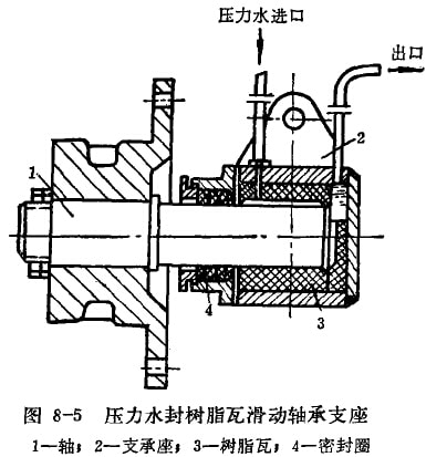 下部支座長期沉沒在礦漿中,因而軸承的密封裝置是保證設(shè)備正常運(yùn)轉(zhuǎn)的關(guān)鍵問題。目前,常用的下部軸承的密封裝置有三種,即機(jī)械密封滾動軸承支座(圖8-4)、壓力水封樹脂瓦滑動軸承支座(圖8-5)及壓力水封橡膠軸襯(一船用皮帶機(jī)廢肢帶組疊而成)。這些結(jié)構(gòu)型式的密封性均不夠理想,最近,在機(jī)械密封滾動軸承支座的基礎(chǔ)上,用手動干油泵注入高壓油,壽命可達(dá)1年左右,其結(jié)構(gòu)如圖8-6所示。