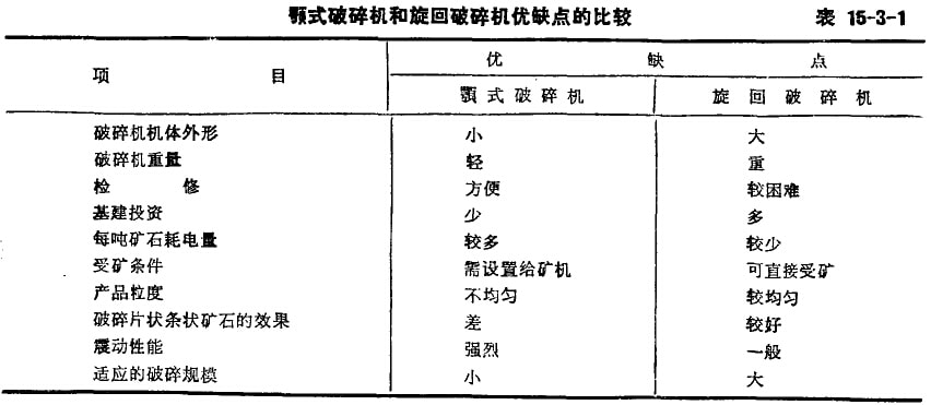 露天礦所用的粗破碎設(shè)備,一般都采用顎式破碎機或旋回破碎機。所選用的設(shè)備,必須滿足破碎產(chǎn)品粒度和生產(chǎn)能力的要求,也需考慮給礦中的最大粒度不得大于被碎機給礦口的0.85倍。顎式破碎機和旋回破碎機又各有其優(yōu)缺點,故在選擇設(shè)備時還要根據(jù)具體情況而定,一般礦山規(guī)模較小時宜采用顎式破碎機。顎式和旋回的優(yōu)缺點比較見表15-3-1。