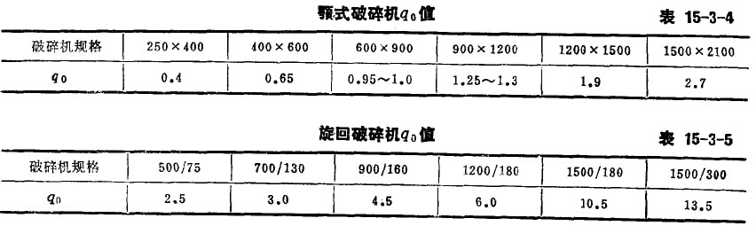 qo——顎式、旋回破碎機單位排礦口寬度的生產(chǎn)能力,噸/毫米·時,查表15-3-4和表15-3-5;