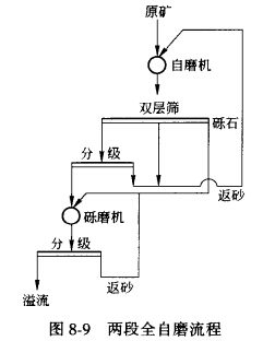 兩段全自磨流程是指第一段用自磨機(jī)粗磨,第二段用礫磨機(jī)進(jìn)行細(xì)磨的磨礦工藝,如圖8—9 所示。因礫磨機(jī)的磨礦介質(zhì)(礫石)取自第一段自磨機(jī),從實(shí)質(zhì)上說它也算是礦石自磨。第一段自磨機(jī)可在閉路條件下工作,也可開路工作。而第二段則都采用閉路磨礦,礫磨機(jī)用的礫石可由破碎系統(tǒng)供給,也可由自磨機(jī)(開礫石窗)供給。