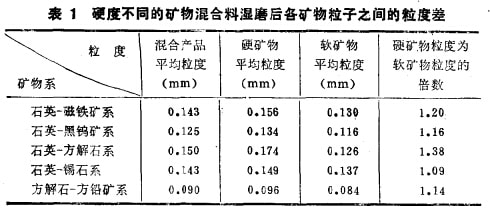 大量的實(shí)驗研究結(jié)果證實(shí),不同硬度礦物的混合礦料磨碎 時,產(chǎn)物中各種礦物粒子之間存在著明顯的粒度差。用多種純礦物混合料在不連續(xù)磨機(jī)中濕磨后所得到的產(chǎn)物中,硬度不同的礦 物粒于的加權(quán)算術(shù)平均粒度值及軟硬礦物的拉度關(guān)如表l所列。