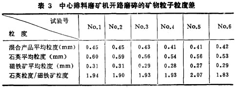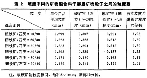 用磁鐵礦與石英按不同比例混合并在不連續(xù)磨機(jī)中進(jìn)行干磨后,所得產(chǎn)品中仍然存在軟(磁鐵礦)硬(石英)礦物粒子的粒度差,其加權(quán)算術(shù)平均值列于表2。