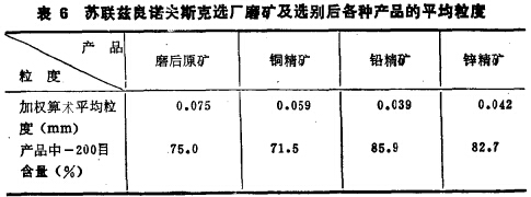 在生產(chǎn)實(shí)踐中,產(chǎn)品存在不同礦物粒子粒度差的例子也很多。廣西某沿鋅礦選廠磨礦及選礦產(chǎn)品的篩析計算結(jié)果列入表 5。從表l可以看出,硬度愈低的礦物粒度愈細(xì),硬度愈高的礦物 粒度愈粗。蘇聯(lián)茲良諾夫斯克選礦廠處理多金屬硫化礦,磨后原礦及各種精礦也存在顯著的粒度差(表6)。