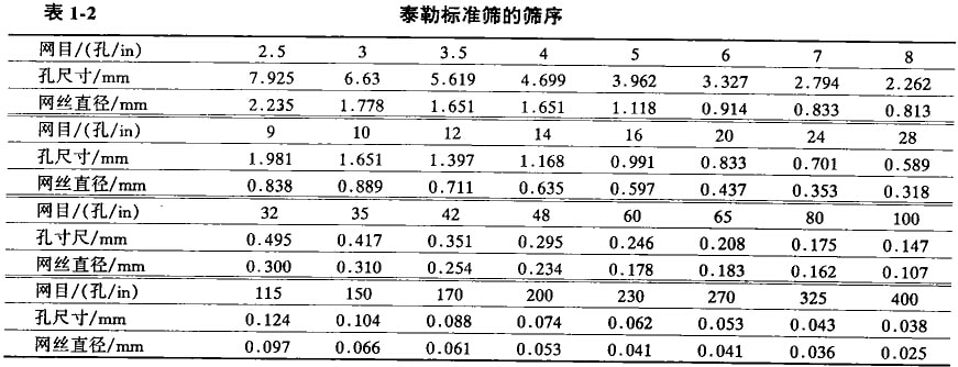 我國通常采用泰勒標準篩,其篩孔大小用網(wǎng)目來表示。網(wǎng)目是指一英寸長度內(nèi)(lin=25.4mm)所具有的篩孔數(shù)目。網(wǎng)目越多篩孔越小。這種篩子是以200目(篩孔寬為0.074mm)作為基本篩,篩孔由上到下逐漸減小,構成篩序。兩個相鄰篩子的篩孔尺寸之比稱為篩比,泰勒標準篩有兩個篩比,即基本篩比和補充篩比。補充篩比即在篩比為√2的基本篩序戶間又插入一套篩比為√2的附加篩序構成。篩孔尺寸可根據(jù)篩比計算。例如計算基本篩的—卜一基本篩序為150目的篩子篩孔尺寸時,用基本篩的篩孔乘以基本篩比確定,即0.074x√2=0.104mm。若計算兩篩之間的補充篩篩孔尺寸,則用基本篩的篩孔尺寸乘以補充篩比得到,即0.074x4√2=0.088mm。泰勒標準篩的篩序列于表1-2中。