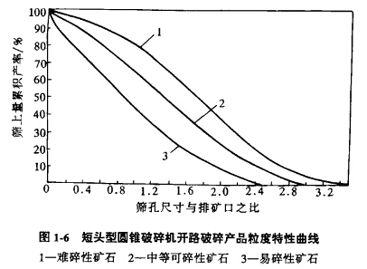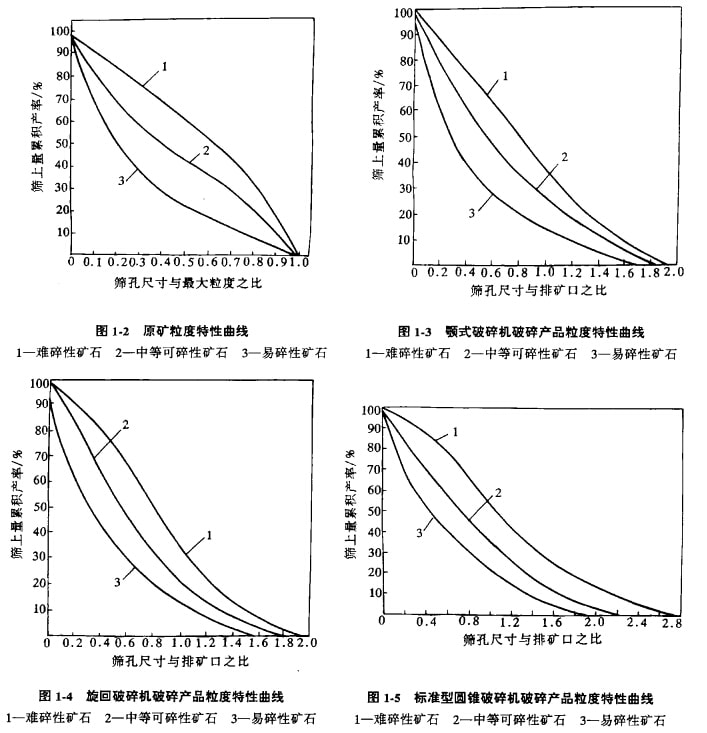 如圖1-2—圖l-7所示,從粒度特性曲線圖中看出,難碎性礦石的粒度特性曲線1都是凸形曲線,這表明礦石中粒度較大的粒級占的質量百分數(shù)較大;中等可碎性礦石的粒度特性曲線2都近似于直線,這表明礦石中各種粒級所占質量的百分數(shù)大致相等;易碎性礦石的粒度特性曲線3都是凹形曲線,這表明該礦石中細粒級所占質量的百分數(shù)比較大。根據(jù)粒度特性曲線,可比較各種礦石的破碎難易程度,檢查破碎機械的工作情況,比較各種破碎機的破碎效果。