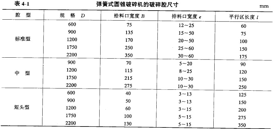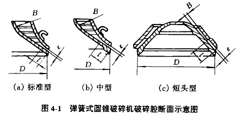 原來(lái)所用的標(biāo)記是用漢語(yǔ)拼音字母和動(dòng)錐大頭直徑表示,如PYB2200,PYZ2200和PYc6200。其中,P為破碎機(jī),Y為圓錐,B為標(biāo)準(zhǔn)型,Z為中型,D為短頭型,2200為動(dòng)錐大頭直徑(mm)。彈簧式圓錐破碎機(jī)的破碎腔斷面形狀,如圖4-1所示。其破碎腔尺寸見(jiàn)表4-1。