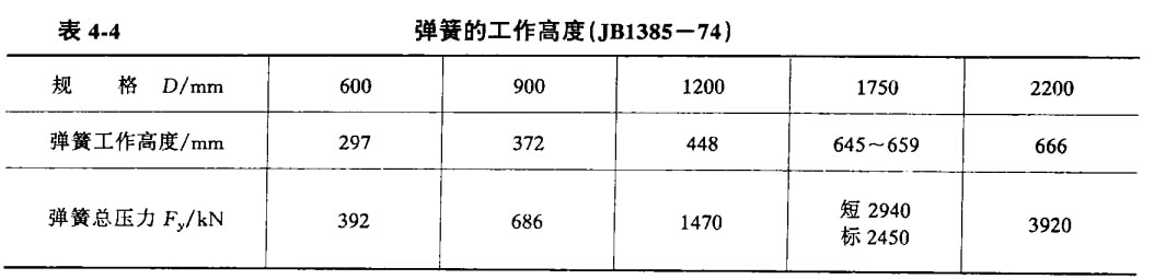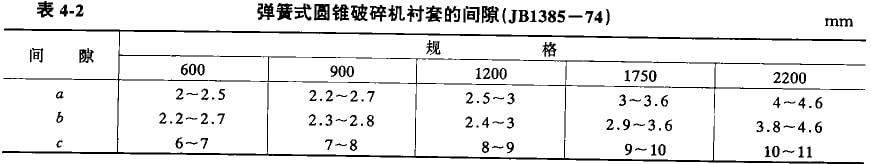 安裝在機(jī)架周圍的彈簧6是破碎機(jī)的保險(xiǎn)裝置。當(dāng)破碎腔中掉入非破碎物時(shí),支承在彈簧上的支承環(huán)和調(diào)整環(huán)力求向上抬起而壓縮彈簧6,從而增大了排料口間隙,使非破碎物經(jīng)排料口排出,避免機(jī)件破壞。彈簧的張緊程度對(duì)機(jī)器的正常工作具有很大的意義。在擰緊彈簧時(shí),應(yīng)考慮到使其留有一定的壓縮裕量。破碎機(jī)每組彈簧壓縮后的工作高度見(jiàn)表4-4。