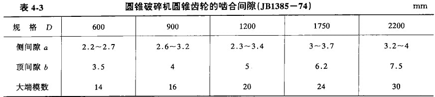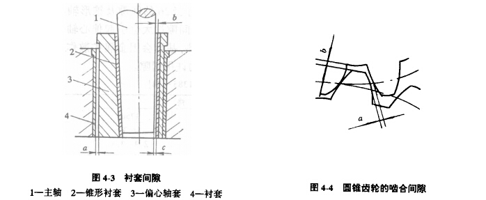 偏心軸套31支承在由三片圓盤組成的止推軸承27上.最下面的鋼圓盤固定在機(jī)架下蓋28上,上面的鋼圓盤與偏心軸套用銷釘相聯(lián),并隨之轉(zhuǎn)動(dòng),而中間的青銅圓盤則作相對(duì)滑動(dòng)。青銅圓盤的總厚度每年至少要檢查兩次,因?yàn)榍嚆~圓盤磨損后,就要減少圓錐齒輪的嚙合間隙。圓錐齒輪嚙合側(cè)面向隙不足.就會(huì)在齒面和傳動(dòng)軸的軸展上產(chǎn)生很大的附加負(fù)荷。圓錐齒輪的嚙合間隙,如圖4—4所示。其值見(jiàn)表4-3。