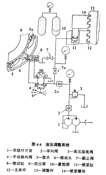 調(diào)整排料口,是靠推動(dòng)缸8,通過(guò)防塵罩9的凸臺(tái),使調(diào)整環(huán)13旋轉(zhuǎn)來(lái)實(shí)現(xiàn)。調(diào)整過(guò)程如下;首先將截止閥7打開,鎖緊缸11油壓從10MPa降至零,使調(diào)整環(huán)13與支承環(huán)12的連接螺紋放松。然后啟動(dòng)14MPa壓力的雙級(jí)葉片泵1,壓力油通過(guò)單向閥2,高壓溢流閥3(即安全閥,壓力調(diào)到10MPa)和單向閥2a,進(jìn)入三位四通手動(dòng)換向閥4。