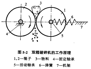 以圖5-2所示的雙輥破碎機(jī)為例來介紹其工作原理。輥?zhàn)?支承在固定軸承4上,輥?zhàn)?支承在活動(dòng)軸承5上;顒(dòng)軸承5借助彈簧6推向左方的擋塊位置處。兩輥?zhàn)佑呻妱?dòng)機(jī)帶動(dòng)相向轉(zhuǎn)動(dòng),物料經(jīng)給料箱給入兩輥?zhàn)又g。物料由于受輥?zhàn)优c物料之間摩擦力作用,而被帶入兩個(gè)輥?zhàn)又g的破碎腔內(nèi),受擠壓破碎后,自下部排出。兩輥?zhàn)又g的最小間隙稱為排料門寬度,破碎產(chǎn)品的粒度即由它的大小來決定。