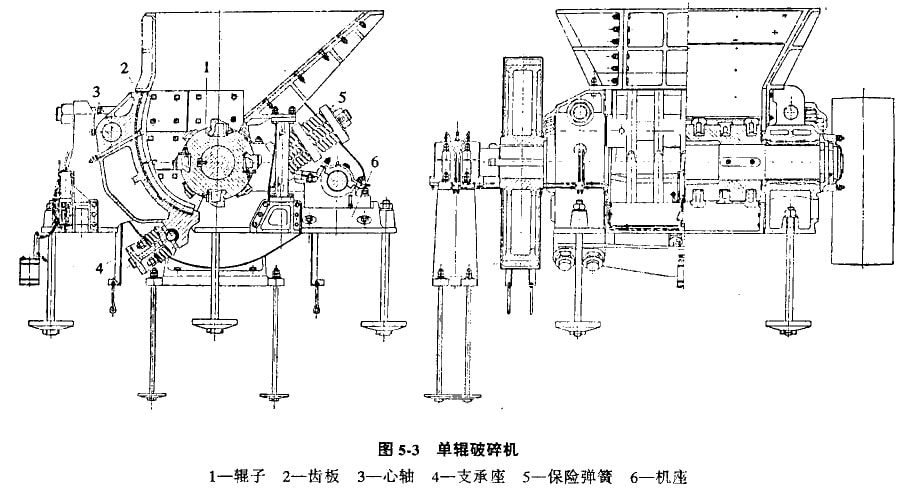 單輥破碎機(jī)又稱顎輥破碎機(jī),構(gòu)造如圖5—3所示。單輥破碎機(jī)是由一個(gè)轉(zhuǎn)動(dòng)的輥?zhàn)?和一塊齒板2組成。破碎機(jī)的輥?zhàn)?表面鑲有許多牙齒,以增加嚙入料塊的尺寸,牙齒磨損后,可以拆下更換新的。與輥?zhàn)訕?gòu)成破碎腔的齒板2和頤式破碎機(jī)的動(dòng)顎相似,其上端懸掛在心軸3上,下端支承在和保險(xiǎn)彈簧5相聯(lián)接的支承座4上。當(dāng)?shù)羧敕瞧扑槲飼r(shí),齒板擠壓支承座,支承座再通過螺桿、螺帽和壓板繼續(xù)壓縮彈簧而增大排料門,使非破碎物排出去。非破碎物排出后,借助彈簧的作用,使徘料n又恢復(fù)到原來的大小。輥?zhàn)虞S的兩端支承在裝于機(jī)座6兩側(cè)壁內(nèi)的滑動(dòng)軸承上,電機(jī)通過三角皮帶和一對齒輪帶動(dòng)輥?zhàn)愚D(zhuǎn)動(dòng)。破碎機(jī)的傳動(dòng)拍軸承和傳動(dòng)齒輪采用稀油潤滑,輥?zhàn)逾櫤托拟欇S承采用半自動(dòng)干泊集中潤滑。