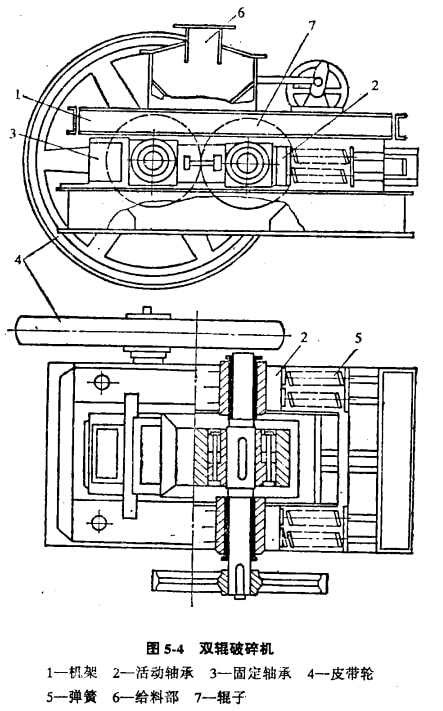 常用的一種輥?zhàn)悠扑闄C(jī)是雙輥破碎機(jī),它的構(gòu)造如圖5-4所示。它由機(jī)架、一對輥?zhàn)、三角度帶傳?dòng)裝置和彈簧保險(xiǎn)裝謹(jǐn)?shù)戎考M成。兩臺電機(jī)通過皮帶輪4傳動(dòng),帶動(dòng)兩輥?zhàn)?相向轉(zhuǎn)動(dòng)。一個(gè)輥?zhàn)拥挠臀那笤谂c機(jī)架固定在一起的固定軸承3上,另一個(gè)輥?zhàn)拥妮S支承在活動(dòng)軸承2上;顒(dòng)軸承2可以沿機(jī)架尋軌水平移動(dòng),使兩輥?zhàn)娱g的排料口寬度在必要時(shí)可以增大,將非破碎物排出機(jī)外。
