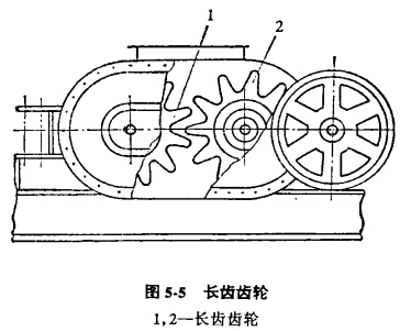圖5-4所示雙輥破碎機(jī)的每個(gè)輥?zhàn)佣加蓡为?dú)的電機(jī)帶動(dòng)。也有使用一臺電機(jī)通過皮帶傳動(dòng)帶動(dòng)固定輥?zhàn)樱潭ㄝ佔(zhàn)有涞牧硪欢搜b有齒輪,通過齒輪帶動(dòng)活動(dòng)輥?zhàn)。由于物料性質(zhì)的變化使活動(dòng)輥?zhàn)幼笥乙苿?dòng),所以齒輪齒高必須增加,以防嚙合脫離。雙輥破碎機(jī)采用的長齒齒輪傳動(dòng)如圖5-5所示。它的特點(diǎn)是允許運(yùn)轉(zhuǎn)中改變中心距而不破壞嚙合特性。
