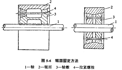 輥式破碎機(jī)的輥?zhàn)佑奢伱、軸毅、錐形孤鐵、主軸等主要部件組成。軸鼓心部用镕與主軸連接,外表面呈錐形,與輥面的錢孔配合。利用三塊錐面弧鐵、螺桿、螺帽等零件,使輥面與軸教緊緊地結(jié)合在一起。輥面用高錳鋼,鎳硬白口鑄鐵、高銀白口鑄鐵等材料制造。圖5-6是一種輥面與軸毅固定方法的示意圖。