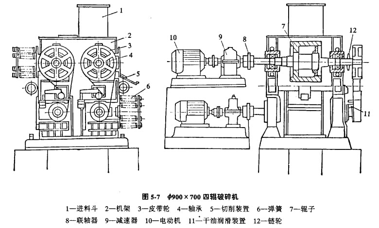 四輥破碎機(jī)實(shí)質(zhì)上是由兩臺規(guī)格相同的雙輥破碎機(jī)里疊組成的。圖5-7是φ900x700四輥破碎機(jī)結(jié)構(gòu)。從輥?zhàn)?的構(gòu)造和彈簧保險(xiǎn)裝置6上看,它與對輥機(jī)沒有什么區(qū)別。但是,它的輥?zhàn)虞S是支承在自動(dòng)調(diào)心滑動(dòng)軸承4上;它的傳動(dòng)裝置是由兩臺電機(jī)10、兩臺減速機(jī)9、兩套皮帶輪3傳動(dòng)組成的。