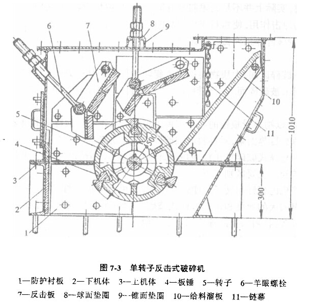 我國生產(chǎn)的φ500x400單轉子反擊式破碎機的構造如圖7-3所示。這種破碎機主要由上下機架、轉子、反擊板等部分組成。電動機經(jīng)三角皮帶傳動使轉子高速回轉,迎著物料下落方向進行沖擊而使物料不斷破碎至小顆粒后由機體下部排出。