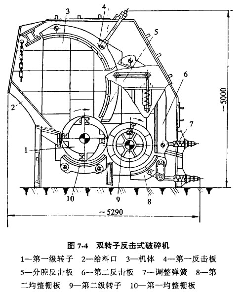 我國生產(chǎn)的φ1250x1250雙轉于反擊式破碎機的構造如圖7-4所示。該機具有破碎比大、生產(chǎn)率高、電耗少等待點。