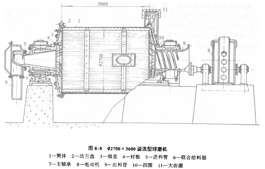 φ2700 x 3600溢流型球磨機的構(gòu)造如圖8-8所示,除排料部與格子型球磨機構(gòu)造不同外,其他部分基本相同。