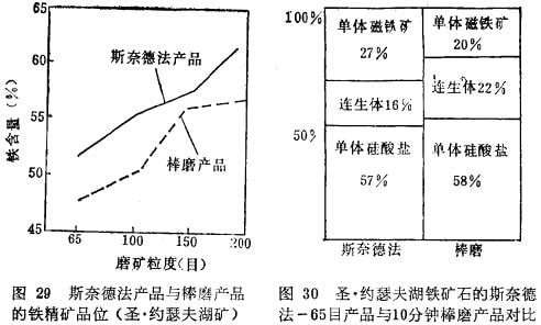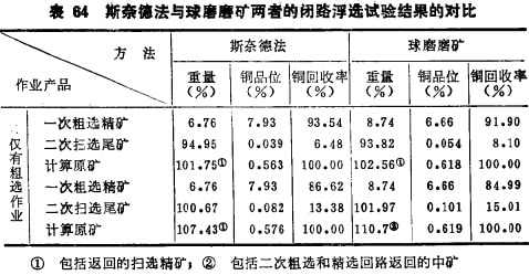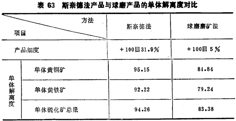 用磁鐵礦、斑巖銅礦、銅鎳礦、鋁釩土和石棉等作此方法的半工業(yè)性對比試驗得出:破砟的產(chǎn)品比球磨或棒磨解離度髙,過粉碎輕,回收率和精礦品位都高于球磨或棒磨。圖29~31和表63 和表64列出了斯奈德法的產(chǎn)品單體解離度,精礦品位及回收率與棒磨及球磨的對比結(jié)果?梢姡@種方法比較優(yōu)越,影響推廣應(yīng)用的主要障礙是快速閥門的磨損嚴重。