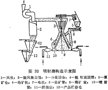噴射磨礦機也是一種解離度髙及選擇性磨碎作用強的新型細磨機,圖32是圓錐型氣流噴射式磨礦機的構(gòu)造示意圖。噴射式磨礦機的工作過程及原理主要是利用髙溫壓縮空氣(或過熱蒸汽或其它預(yù)熱氣體)作介質(zhì),當(dāng)壓縮空氣在燃燒室11預(yù)熱后,經(jīng)噴射管10的噴咀放出,因其突然減壓體積膨脹,以100~200m/s速度運動的氣流,將來自給礦管8落下的5~3mm的被磨物料沿切線方向吹入圓錐形的磨礦室內(nèi),利用高速運動著的礦粒間相互沖擊及磨剝即可達到自行碎裂。已粉碎的礦粒在分級設(shè)備的配合下進行分級,其中合格產(chǎn)品被氣流帶入旋風(fēng)集塵器,粗顆粒則經(jīng)返回 管再度落入磨礦室的底部重新粉碎。