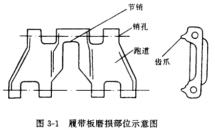 在考慮提高零件使用壽命時,應(yīng)首先從改進(jìn)零件的結(jié)構(gòu)設(shè)計(jì)開始。不合理或不完美的設(shè)計(jì)往往會使磨損大大加劇,使用壽命明顯降低。反之,有時在結(jié)構(gòu)設(shè)計(jì)上稍作改進(jìn),往往會很容易或明顯地提高零件的耐磨性。改善零件結(jié)構(gòu)的設(shè)計(jì)方法是:應(yīng)用摩擦學(xué)知識,主要是磨料磨損規(guī)律知識,合理改變零部件結(jié)構(gòu)設(shè)計(jì),即通過對磨損零件摩擦學(xué)系統(tǒng)分析以后,從改善磨損條件出發(fā),適當(dāng)改變零件的幾何形狀、配合方式以及加大其工作部分尺寸,或用特殊的工藝方法。這些參數(shù)改變后,既能滿足設(shè)備正常運(yùn)轉(zhuǎn),又不致增加過多消耗,使耐磨性大大提高。這已經(jīng)被許多應(yīng)用實(shí)例所證實(shí)。例如:50年代,拖拉機(jī)履帶板都是五孔型履帶板.后改為七孔履帶板,將易磨損部位的節(jié)銷厚度適當(dāng)增加,壽命比五孔的提高了,得到普遍采用,如圖3-1所示。