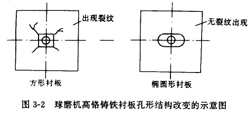 近幾年來,高格鑄鐵材料在耐磨零件中得到廣泛地應(yīng)用。盡管這種材料有很高的硬度和耐磨性,然而它比高錳鋼及低臺金鋼等材料要脆得多,如果結(jié)構(gòu)設(shè)計(jì)不當(dāng),往往出于開裂造成早期失效。比如高鉻鑄鐵制造的球磨機(jī)襯板,易由中間方孔四角裂紋擴(kuò)張開裂,后改為橢圓形孔,并注意安裝及使用條件,減少了應(yīng)力集中和開裂,使高鉻鑄鐵襯板,在球磨機(jī)中得到成功的應(yīng)用,如圖3-2所示。