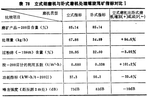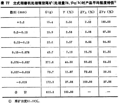 為了說明立式磨的工作特性,在容積相同的臥式及立式磨機中用某公司的老尾礦進行了磨碎對比試驗,老尾礦試料用螺旋溜槽選分為精礦及尾礦兩部分,精礦含鐵礦物較多,比較難磨,密度較大,尾礦的密度較小,比較好磨一些。用可磨性不同的兩份試料驗證立式磨的工作性能,試驗用的立式磨及臥式磨的結(jié)構(gòu)及工作參數(shù)見表72示。表73及74中分別列出臥式磨及立式磨磨碎螺旋精礦的產(chǎn)品特性,表75列出臥式與立式磨磨碎螺旋精礦的磨礦指標對比。表76及77分別列出臥式及立式磨磨碎螺旋尾礦的產(chǎn)品特性,表78及79分別列出臥式及立式磨在不同磨礦細度下磨碎螺 旋尾礦的指標對比。
