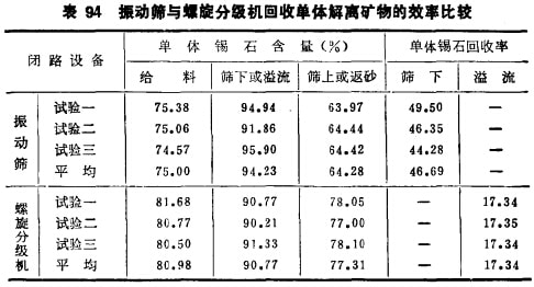 眾所周知,螺旋分級機(jī)的分級效率不高,一般按分離粒度計算的分級效率只有30?50%或60%左右。如果采用各類振動篩進(jìn)行分級,篩分效率可達(dá)70%以上。細(xì)粒分級時若采用水力旋流 器,分級效率一般可達(dá)60?80%或80?90%;采用細(xì)篩進(jìn)行篩分 時,超聲波細(xì)篩的篩分效率可高達(dá)90?95%,筏瑞克細(xì)篩的篩分 效率也可達(dá)到70?80%,效率均比水力旋流器高;⌒魏Y及平面細(xì)篩的篩分效率雖然較低,但有利于對脆性大密度礦物的及時排 出。如果按單體有用礦物(回收的目的礦物)的分布來計算分級 效率,則細(xì)篩的分離效率將顯著高于水力分級設(shè)備。例如前述的 周邊排料磨機(jī)與0.3mm篩孔的濕式振動篩組成閉路,按礦石粒級計的篩分效率77.19%,如果按磁鐵礦分布計算則效率為79.00%; 而在水力分級設(shè)備中,由于大量大密度細(xì)粒沉入返砂,所以按磁鐵礦分布計算的分離效率顯著變差。前述的中心排料磨機(jī)與螺旋分級機(jī)閉路,按礦石粒級計的分級效率為50.82%,但按磁鐵礦分布計的分離效率則只有34.35%。表94列出了試驗振動篩與螺旋分級機(jī)分離單體大密度礦物的分離效率,可見,篩子比螺旋分級機(jī)高出約一倍左右。