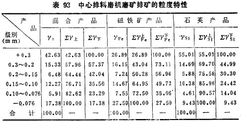 性脆易碎的大密度礦物在磨礦過松中本身就容易過磨及過粉碎,如果磨機(jī)是與水力分級設(shè)備組成閉路,則由下大密度礦物沉落速度快易在沉砂中富集,沉砂返冋磨機(jī)再磨便使大密度礦物再次遭受磨碎,這就加重其過磨及粉碎,結(jié)果在磨機(jī)排礦中使大密度脆性礦物的粒度比其他脈石礦物細(xì)得多,表93中列出了中心排料球磨機(jī)與螺旋分級機(jī)閉路磨碎磁鐵礦及石英混合料(各占50%)時磨機(jī)排礦產(chǎn)品的粒度特性。