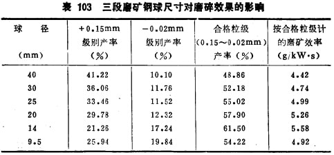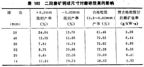 例如,用云錫公司卡房采選廠二段磨礦及三段磨礦給礦,通過試驗方法確定它們的最適宜球徑:二段磨給曠的最大粒度1.2mm,要求的磨礦粒度0.3mm;三段磨給礦最大粒度0.7mm, 規(guī)定的磨礦粒度0.15mm;產(chǎn)品中-0.02mm級別算為過粉碎級表102及表103的試驗結果說明: