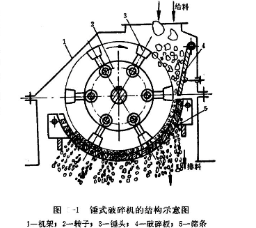 錘式破碎機(jī)的基本結(jié)構(gòu)如圖1所示。礦石給入破碎機(jī)后,即受到髙速回轉(zhuǎn)錘頭的沖擊而破碎,破碎了的礦石從錘頭處獲得動(dòng)能以髙速?zèng)_向破碎板和篩條,同時(shí)還有礦石之間相互撞擊而遭到進(jìn)一步破碎。小于篩條縫隙的礦石從縫隙中排出,個(gè)別大于縫隙的礦石在篩條上再經(jīng)錘頭的附加沖擊、研磨而破碎,達(dá)到合格粒度后即從篩條縫隙中排出。