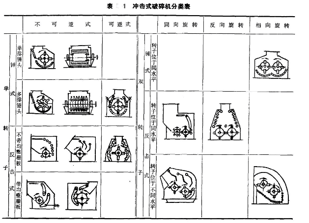 沖擊式破碎機(jī)的結(jié)構(gòu)型式很多,其分類方法見表1。
