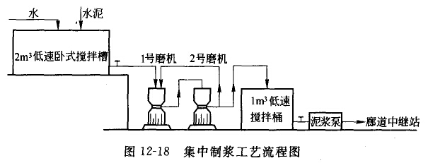 和普通水泥灌漿工藝流程相比,灌漿工藝流程中僅增加一臺(tái)高效水泥濕磨機(jī),但在施工中,水泥顆粒的組成情況可以隨時(shí)調(diào)整,即談流程既能適用于全部為細(xì)裂隙或滲透性很小的扎段灌漿,也適用于粗細(xì)裂隙并存曲孔段癟漿,還能滿足一般裂隙的湛漿,根據(jù)灌段地質(zhì)情況和壓水試驗(yàn)資料判斷該灌段巖體裂隙是細(xì)裂隙時(shí),水泥漿通過(guò)高效水泥濕磨機(jī)研磨細(xì)化后再灌漿,并可根據(jù)被灌漿裂隙大小,在不停止灌漿作業(yè)的情況下,通過(guò)單次或循環(huán)研磨以及調(diào)整磨頭磨盤問(wèn)隙生產(chǎn)山適合于該裂隙的綱水泥漿液再灌漿;若遇到漏水率較大的孔段,可將高效水泥濕磨機(jī)磨頭磨盤問(wèn)隙調(diào)大或者把高速制漿機(jī)并制好的普通水泥漿液直接排人普通攪拌機(jī)進(jìn)行灌漿;若酒漿過(guò)程小出現(xiàn)失水回濃現(xiàn)象,并判斷為水泥細(xì)度不夠時(shí),則用濕磨細(xì)水泥漿液,同時(shí)將孔內(nèi)和管道中酌循環(huán)漿液導(dǎo)入高效水泥濕磨機(jī)留后再用?傊摑衲ゼ(xì)水泥怨?jié){工藝流程非常靈活萬(wàn)便,隨時(shí)可以變換而適應(yīng)于被灌孔段,整個(gè)工藝系統(tǒng)的生產(chǎn)能力非常崗,可以長(zhǎng)時(shí)間連續(xù)運(yùn)行,該濕磨細(xì)水泥灌漿工藝流程中的細(xì)水泥制槳系統(tǒng)不但適用于單元機(jī)組中,而且也適用于集小制漿系統(tǒng)中。當(dāng)需要集中制漿供應(yīng)多臺(tái)灌漿機(jī)組成時(shí),可按圖12-18所示中的工藝流程制漿。